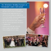 The All Inclusive Wedding Packages at Portsmouth Country Club include:• Unlimited consultations with Portsmouth Country Club staff to assist you in all of your planning needs.• Exclusive use of the banquet hall on the day of your event. We only schedule one wedding per day.• Access to the beautifully landscaped grounds for pictures.• Linens offered in a wide array of colors.• Hurricane lamps with tapered candle centerpieces.• Your choice of passed and stationary Hors d’oeuvres.• A champagne toast.• A full service bar for the time of your event.• Choice of banquet or buffet-style dinner.• All taxes and applicable service charges.